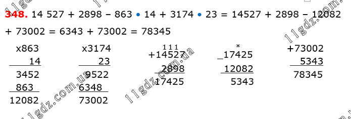 14 527 + 2898 – 863 • 14 + 3174 • 23 = 14527 + 2898 – 12082 + 73002 = 6343 + 73002 = 78345