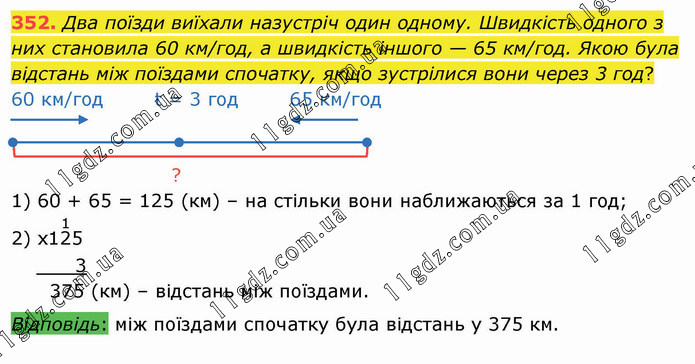 Два поїзди виїхали назустріч один одному. Швидкість одного з них становила 60 км/год, а швидкість іншого — 65 км/год. Якою була відстань між поїздами спочатку, якщо зустрілися вони через 3 год? 60 км/год t = 3 год 65 км/год ? 1) 60 + 65 = 125 (км) – на стільки вони наближаються за 1 год;