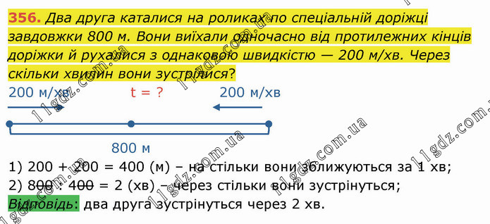 Два друга каталися на роликах по спеціальній доріжці завдовжки 800 м. Вони виїхали одночасно від протилежних кінців доріжки й рухалися з однаковою швидкістю — 200 м/хв. Через скільки хвилин вони зустрілися? 200 м/хв t = ? 200 м/хв 800 м 1) 200 + 200 = 400 (м) – на стільки вони зближуються за 1 хв; 2) 800 : 400 = 2 (хв) – через стільки вони зустрінуться; Відповідь: два друга зустрінуться через 2 хв.