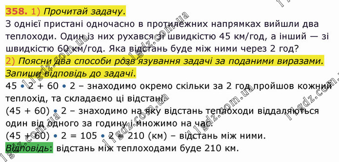 1) Прочитай задачу. З однієї пристані одночасно в протилежних напрямках вийшли два теплоходи. Один із них рухався зі швидкістю 45 км/год, а інший — зі швидкістю 60 км/год. Яка відстань буде між ними через 2 год? 2) Поясни два способи розв’язування задачі за поданими виразами. Запиши відповідь до задачі. 45 • 2 + 60 • 2 – знаходимо окремо скільки за 2 год пройшов кожний теплохід, та складаємо ці відстані. (45 + 60) • 2 – знаходимо на яку відстань теплоходи віддаляються один від одного за годину і множимо на час. (45 + 60) • 2 = 105 • 2 = 210 (км) – відстань між ними. Відповідь: відстань між теплоходами буде 210 км.