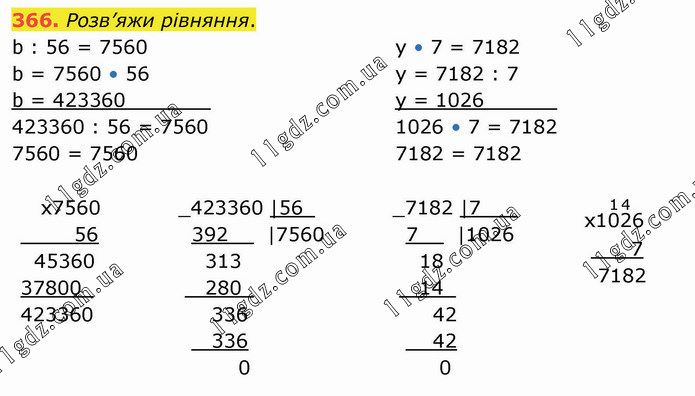 Розв’яжи рівняння. b : 56 = 7560 b = 7560 • 56 b = 423360_______ 423360 : 56 = 7560 7560 = 7560 y • 7 = 7182 у = 7182 : 7 у = 1026______ 1026 • 7 = 7182 7182 = 7182