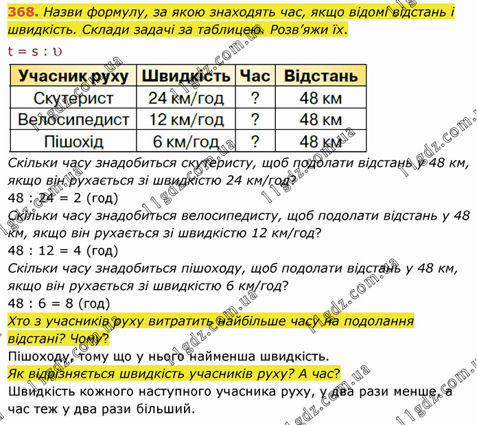 Назви формулу, за якою знаходять час, якщо відомі відстань і швидкість. Склади задачі за таблицею. Розв’яжи їх. t = s : v Скільки часу знадобиться скутеристу, щоб подолати відстань у 48 км, якщо він рухається зі швидкістю 24 км/год? 48 : 24 = 2 (год) Скільки часу знадобиться велосипедисту, щоб подолати відстань у 48 км, якщо він рухається зі швидкістю 12 км/год? 48 : 12 = 4 (год) Скільки часу знадобиться пішоходу, щоб подолати відстань у 48 км, якщо він рухається зі швидкістю 6 км/год? 48 : 6 = 8 (год) Хто з учасників руху витратить найбільше часу на подолання відстані? Чому? Пішоходу, тому що у нього найменша швидкість. Як відрізняється швидкість учасників руху? А час? Швидкість кожного наступного учасника руху, у два рази менше, а час теж у два рази більший.