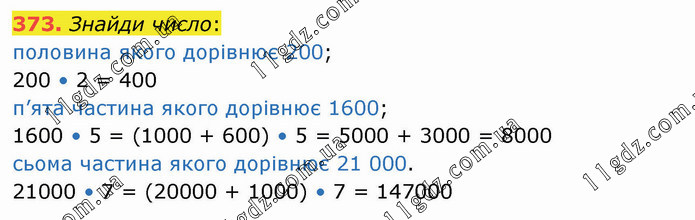 Знайди число: половина якого дорівнює 200; 200 • 2 = 400 п’ята частина якого дорівнює 1600; 1600 • 5 = (1000 + 600) • 5 = 5000 + 3000 = 8000 сьома частина якого дорівнює 21 000. 21000 • 7 = (20000 + 1000) • 7 = 147000