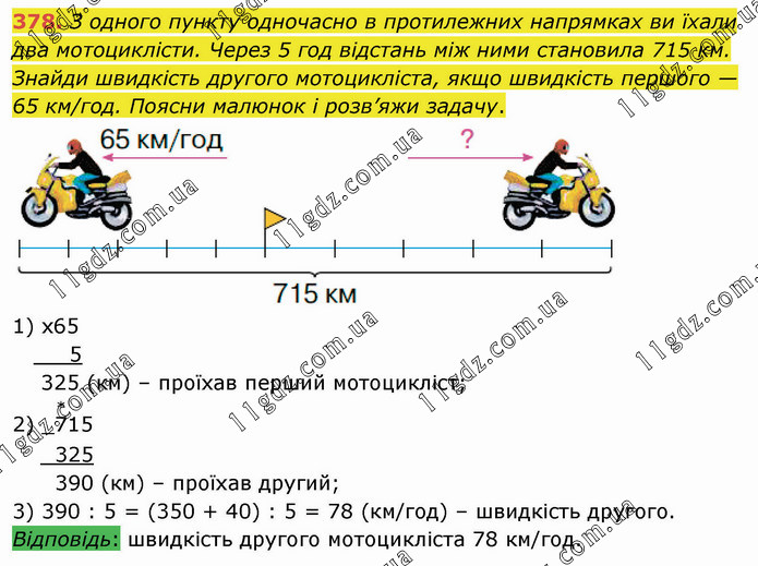 З одного пункту одночасно в протилежних напрямках ви їхали два мотоциклісти. Через 5 год відстань між ними становила 715 км. Знайди швидкість другого мотоцикліста, якщо швидкість першого — 65 км/год. Поясни малюнок і розв’яжи задачу.