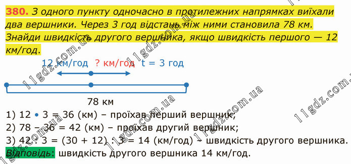 З одного пункту одночасно в протилежних напрямках виїхали два вершники. Через 3 год відстань між ними становила 78 км. Знайди швидкість другого вершника, якщо швидкість першого — 12 км/год. 12 км/год ? км/год t = 3 год 78 км 1) 12 • 3 = 36 (км) – проїхав перший вершник; 2) 78 – 36 = 42 (км) – проїхав другий вершник; 3) 42 : 3 = (30 + 12) : 3 = 14 (км/год) – швидкість другого вершника. Відповідь: швидкість другого вершника 14 км/год.