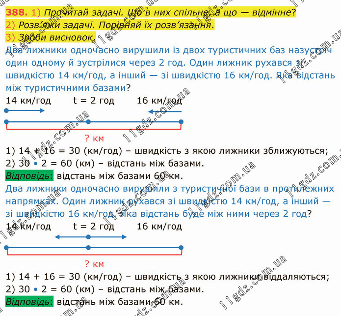 1) Прочитай задачі. Що в них спільне, а що — відмінне? 2) Розв’яжи задачі. Порівняй їх розв’язання. 3) Зроби висновок. Два лижники одночасно вирушили із двох туристичних баз назустріч один одному й зустрілися через 2 год. Один лижник рухався зі швидкістю 14 км/год, а інший — зі швидкістю 16 км/год. Яка відстань між туристичними базами? 14 км/год t = 2 год 16 км/год ? км 1) 14 + 16 = 30 (км/год) – швидкість з якою лижники зближуються; 2) 30 • 2 = 60 (км) – відстань між базами. Відповідь: відстань між базами 60 км. Два лижники одночасно вирушили з туристичної бази в протилежних напрямках. Один лижник рухався зі швидкістю 14 км/год, а інший — зі швидкістю 16 км/год. Яка відстань буде між ними через 2 год? 14 км/год t = 2 год 16 км/год ? км 1) 14 + 16 = 30 (км/год) – швидкість з якою лижники віддаляються; 2) 30 • 2 = 60 (км) – відстань між базами. Відповідь: відстань між базами 60 км.