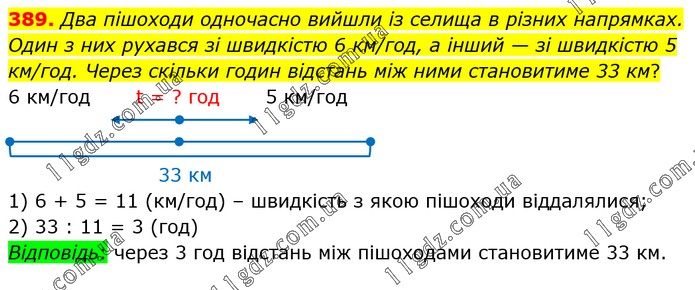 Два пішоходи одночасно вийшли із селища в різних напрямках. Один з них рухався зі швидкістю 6 км/год, а інший — зі швидкістю 5 км/год. Через скільки годин відстань між ними становитиме 33 км? 1) 6 + 5 = 11 (км/год) – швидкість з якою пішоходи віддалялися; 2) 33 : 11 = 3 (год) Відповідь: через 3 год відстань між пішоходами становитиме 33 км.