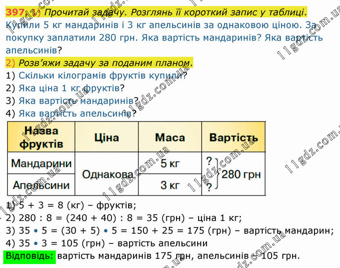 1) Прочитай задачу. Розглянь її короткий запис у таблиці. Купили 5 кг мандаринів і 3 кг апельсинів за однаковою ціною. За покупку заплатили 280 грн. Яка вартість мандаринів? Яка вартість апельсинів? 2) Розв’яжи задачу за поданим планом. 1) Скільки кілограмів фруктів купили? 2) Яка ціна 1 кг фруктів? 3) Яка вартість мандаринів? 4) Яка вартість апельсинів? 1) 5 + 3 = 8 (кг) – фруктів; 2) 280 : 8 = (240 + 40) : 8 = 35 (грн) – ціна 1 кг; 3) 35 • 5 = (30 + 5) • 5 = 150 + 25 = 175 (грн) – вартість мандарин; 4) 35 • 3 = 105 (грн) – вартість апельсини Відповідь: вартість мандаринів 175 грн, апельсинів – 105 грн.