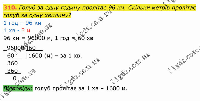 Голуб за одну годину пролітає 96 км. Скільки метрів пролітає голуб за одну хвилину? 1 год – 96 км 1 хв - ? м 96 км = 96000 м, 1 год = 60 хв