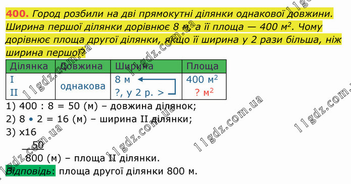 Город розбили на дві прямокутні ділянки однакової довжини. Ширина першої ділянки дорівнює 8 м, а її площа — 400 м2. Чому дорівнює площа другої ділянки, якщо її ширина у 2 рази більша, ніж ширина першої? Ділянка Довжина Ширина Площа І ІІ однакова 8 м ?, у 2 р. > 400 м2 ? м2 1) 400 : 8 = 50 (м) – довжина ділянок; 2) 8 • 2 = 16 (м) – ширина ІІ ділянки;