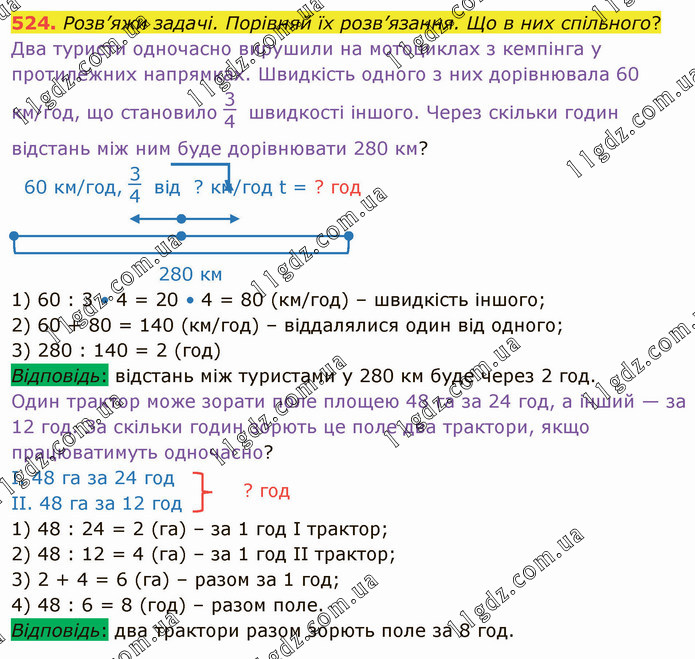 Розв’яжи задачі. Порівняй їх розв’язання. Що в них спільного? Два туристи одночасно вирушили на мотоциклах з кемпінга у протилежних напрямках. Швидкість одного з них дорівнювала 60 км/год, що становило 34 швидкості іншого. Через скільки годин відстань між ним буде дорівнювати 280 км? 60 км/год, 34 від ? км/год t = ? год 280 км 1) 60 : 3 • 4 = 20 • 4 = 80 (км/год) – швидкість іншого; 2) 60 + 80 = 140 (км/год) – віддалялися один від одного; 3) 280 : 140 = 2 (год) Відповідь: відстань між туристами у 280 км буде через 2 год. Один трактор може зорати поле площею 48 га за 24 год, а інший — за 12 год. За скільки годин зорють це поле два трактори, якщо працюватимуть одночасно? І. 48 га за 24 год ІІ. 48 га за 12 год 1) 48 : 24 = 2 (га) – за 1 год І трактор; 2) 48 : 12 = 4 (га) – за 1 год ІІ трактор; 3) 2 + 4 = 6 (га) – разом за 1 год; 4) 48 : 6 = 8 (год) – разом поле. Відповідь: два трактори разом зорють поле за 8 год.