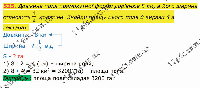 Довжина поля прямокутної форми дорівнює 8 км, а його ширина становить 12 довжини. Знайди площу цього поля й вирази її в гектарах. Довжина – 8 км Ширина - ?, 1/2 від S - ? га 1) 8 : 2 = 4 (км) – ширина поля; 2) 8 • 4 = 32 км2 = 3200 (га) – площа поля. Відповідь: площа поля складає 3200 га.