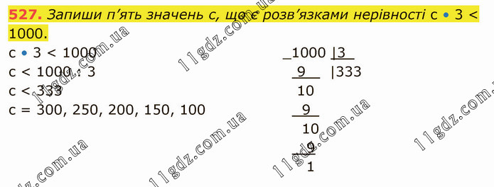 Запиши п’ять значень с, що є розв’язками нерівності с • 3 < 1000. с • 3 < 1000 с < 1000 : 3 c < 333 c = 300, 250, 200, 150, 100