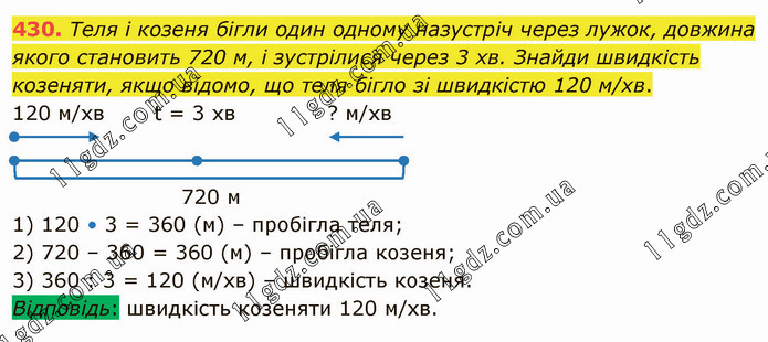 Теля і козеня бігли один одному назустріч через лужок, довжина якого становить 720 м, і зустрілися через 3 хв. Знайди швидкість козеняти, якщо відомо, що теля бігло зі швидкістю 120 м/хв. 120 м/хв t = 3 хв ? м/хв 720 м 1) 120 • 3 = 360 (м) – пробігла теля; 2) 720 – 360 = 360 (м) – пробігла козеня; 3) 360 : 3 = 120 (м/хв) – швидкість козеня. Відповідь: швидкість козеняти 120 м/хв.