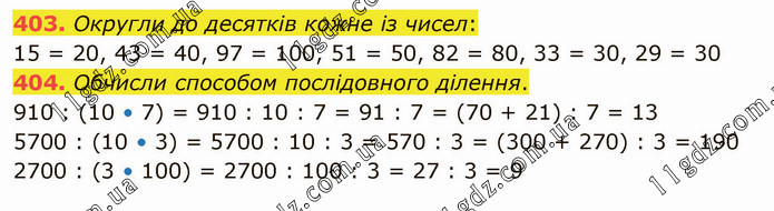 Округли до десятків кожне із чисел: 15 = 20, 43 = 40, 97 = 100, 51 = 50, 82 = 80, 33 = 30, 29 = 30 404. Обчисли способом послідовного ділення. 910 : (10 • 7) = 910 : 10 : 7 = 91 : 7 = (70 + 21) : 7 = 13 5700 : (10 • 3) = 5700 : 10 : 3 = 570 : 3 = (300 + 270) : 3 = 190 2700 : (3 • 100) = 2700 : 100 : 3 = 27 : 3 = 9