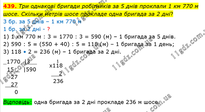 Три однакові бригади робітників за 5 днів проклали 1 км 770 м шосе. Скільки метрів шосе прокладе одна бригада за 2 дні? 3 бр. за 5 днів – 1 км 770 м 1 бр. за 2 дні - ? 1) 1 км 770 м : 3 = 1770 : 3 = 590 (м) – 1 бригада за 5 днів. 2) 590 : 5 = 118 (м) – 1 бригада за 1 день; 3) 118 • 2 = 236 (м) – 1 бригада за 2 дні.