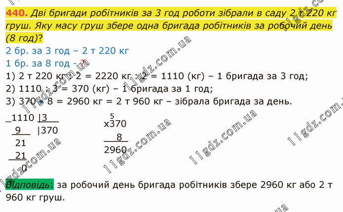 Дві бригади робітників за 3 год роботи зібрали в саду 2 т 220 кг груш. Яку масу груш збере одна бригада робітників за робочий день (8 год)? 2 бр. за 3 год – 2 т 220 кг 1 бр. за 8 год - ? 1) 2 т 220 кг : 2 = 2220 кг : 2 = 1110 (кг) – 1 бригада за 3 год; 2) 1110 : 3 = 370 (кг) – 1 бригада за 1 год; 3) 370 • 8 = 2960 кг = 2 т 960 кг – зібрала бригада за день.