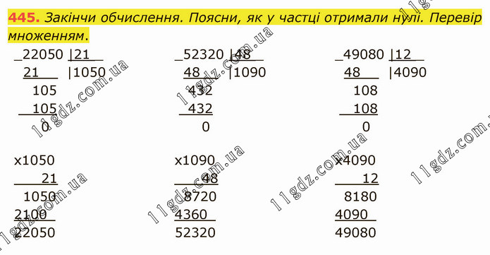 Закінчи обчислення. Поясни, як у частці отримали нулі. Перевір множенням.