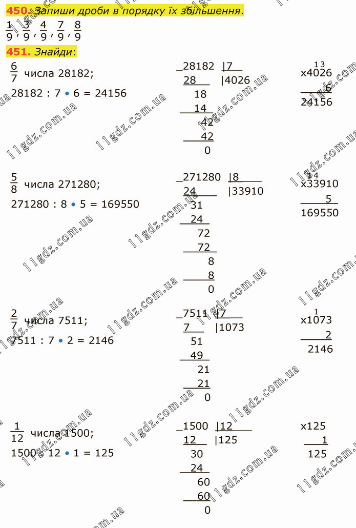 Запиши дроби в порядку їх збільшення. 1/9 , 3/9 , 4/9 , 7/9 , 8/9 451. Знайди: 6/7 числа 28182; 5/8 числа 271280; 2/7 числа 7511; 1/12 числа 1500;
