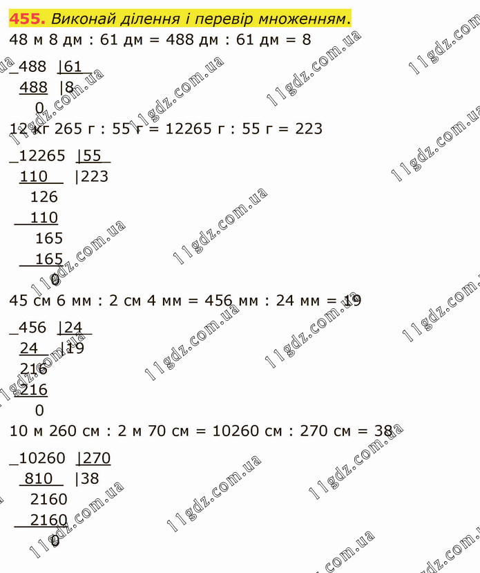Виконай ділення і перевір множенням. 48 м 8 дм : 61 дм = 488 дм : 61 дм = 8 12 кг 265 г : 55 г = 12265 г : 55 г = 223 45 см 6 мм : 2 см 4 мм = 456 мм : 24 мм = 19 10 м 260 см : 2 м 70 см = 10260 см : 270 см = 38