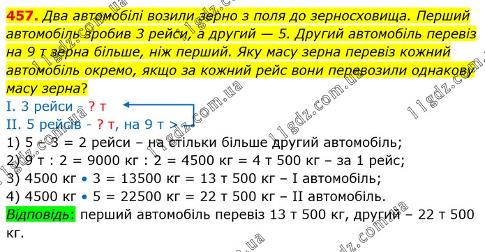 Два автомобілі возили зерно з поля до зерносховища. Перший автомобіль зробив 3 рейси, а другий — 5. Другий автомобіль перевіз на 9 т зерна більше, ніж перший. Яку масу зерна перевіз кожний автомобіль окремо, якщо за кожний рейс вони перевозили однакову масу зерна? І. 3 рейси - ? т ІІ. 5 рейсів - ? т, на 9 т > 1) 5 – 3 = 2 рейси – на стільки більше другий автомобіль; 2) 9 т : 2 = 9000 кг : 2 = 4500 кг = 4 т 500 кг – за 1 рейс; 3) 4500 кг • 3 = 13500 кг = 13 т 500 кг – І автомобіль; 4) 4500 кг • 5 = 22500 кг = 22 т 500 кг – ІІ автомобіль. Відповідь: перший автомобіль перевіз 13 т 500 кг, другий – 22 т 500 кг.