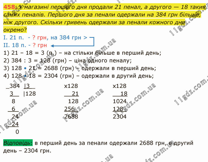 У магазині першого дня продали 21 пенал, а другого — 18 таких самих пеналів. Першого дня за пенали одержали на 384 грн більше, ніж другого. Скільки гривень одержали за пенали кожного дня окремо? І. 21 п. - ? грн, на 384 грн > ІІ. 18 п. - ? грн 1) 21 – 18 = 3 (п.) – на стільки більше в перший день; 2) 384 : 3 = 128 (грн) – ціна одного пеналу; 3) 128 • 21 = 2688 (грн) – одержали в перший день; 4) 128 • 18 = 2304 (грн) – одержали в другий день;