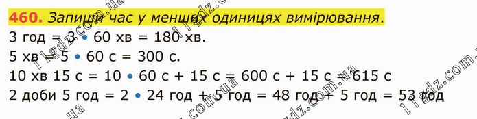 Запиши час у менших одиницях вимірювання. 3 год = 3 • 60 хв = 180 хв. 5 хв = 5 • 60 с = 300 с. 10 хв 15 с = 10 • 60 с + 15 с = 600 с + 15 с = 615 с 2 доби 5 год = 2 • 24 год + 5 год = 48 год + 5 год = 53 год