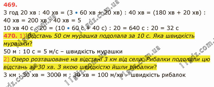 3 год 20 хв : 40 хв = (3 • 60 хв + 20 хв) : 40 хв = (180 хв + 20 хв) : 40 хв = 200 хв : 40 хв = 5 10 хв 40 с : 20 = (10 • 60 с + 40 с) : 20 = 640 с : 20 = 32 с 470. 1) Відстань 50 см мурашка подолала за 10 с. Яка швидкість мурашки? 50 м : 10 с = 5 м/с – швидкість мурашки 2) Озеро розташоване на відстані 3 км від села. Рибалки подолали цю відстань за 30 хв. З якою швидкістю йшли рибалки? 3 км : 30 хв = 3000 м : 30 хв = 100 м/хв – швидкість рибалок