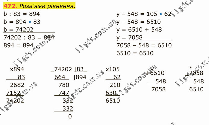 Розв’яжи рівняння. b : 83 = 894 b = 894 • 83 b = 74202______ 74202 : 83 = 894 894 = 894 y – 548 = 105 • 62 у – 548 = 6510 у = 6510 + 548 у = 7058________ 7058 – 548 = 6510 6510 = 6510