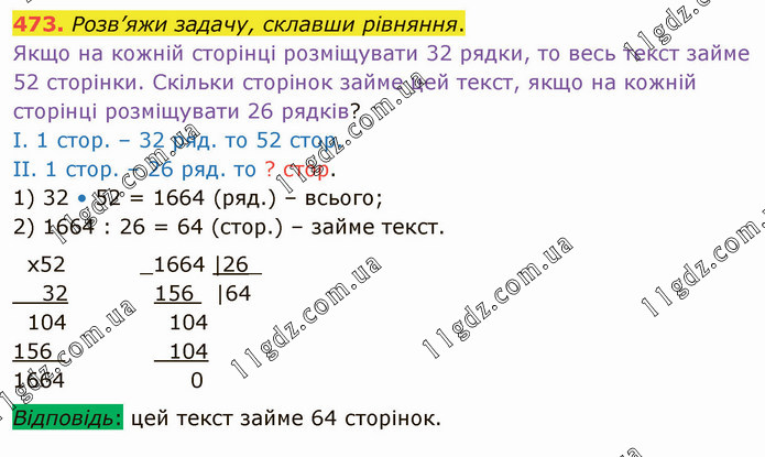 Розв’яжи задачу, склавши рівняння. Якщо на кожній сторінці розміщувати 32 рядки, то весь текст займе 52 сторінки. Скільки сторінок займе цей текст, якщо на кожній сторінці розміщувати 26 рядків? І. 1 стор. – 32 ряд. то 52 стор. ІІ. 1 стор. – 26 ряд. то ? стор. 1) 32 • 52 = 1664 (ряд.) – всього; 2) 1664 : 26 = 64 (стор.) – займе текст.