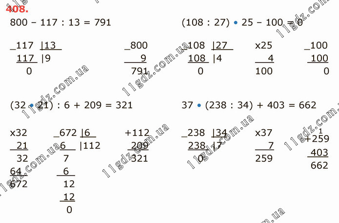 800 – 117 : 13 = 791 (108 : 27) • 25 – 100 = 0 (32 • 21) : 6 + 209 = 321 37 • (238 : 34) + 403 = 662