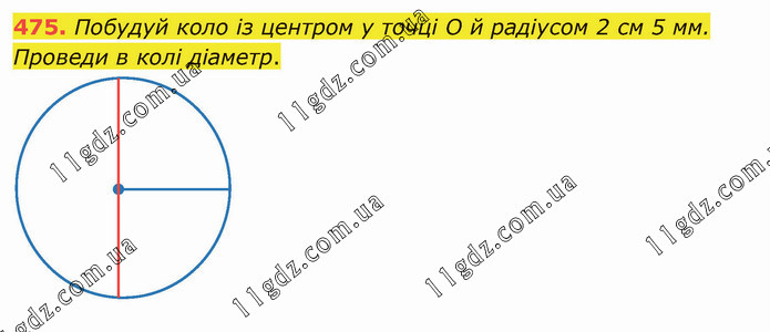 Побудуй коло із центром у точці О й радіусом 2 см 5 мм. Проведи в колі діаметр.