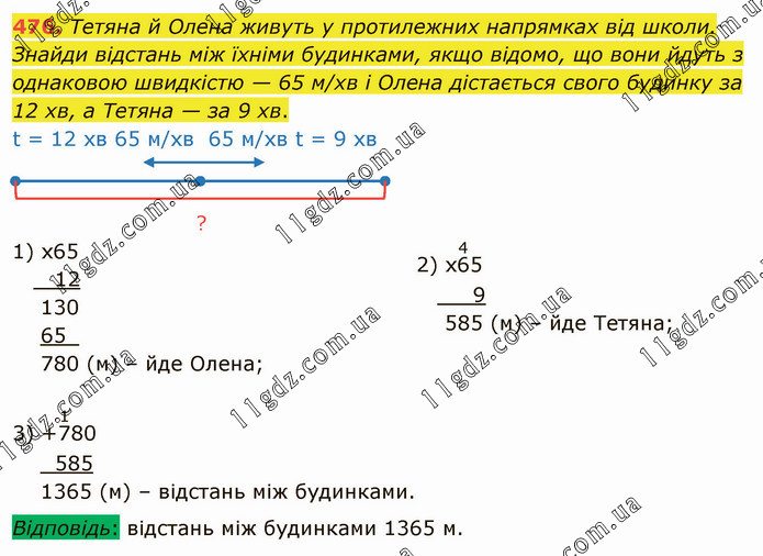 Тетяна й Олена живуть у протилежних напрямках від школи. Знайди відстань між їхніми будинками, якщо відомо, що вони йдуть з однаковою швидкістю — 65 м/хв і Олена дістається свого будинку за 12 хв, а Тетяна — за 9 хв.