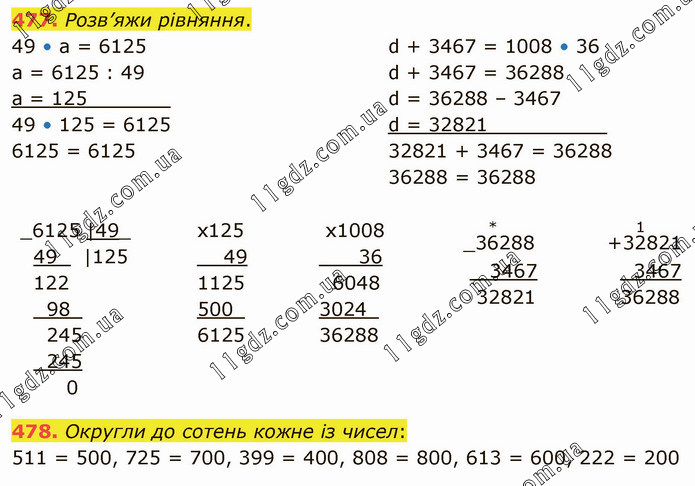 Розв’яжи рівняння. 49 • а = 6125 а = 6125 : 49 а = 125_______ 49 • 125 = 6125 6125 = 6125 d + 3467 = 1008 • 36 d + 3467 = 36288 d = 36288 – 3467 d = 32821__________ 32821 + 3467 = 36288 36288 = 36288 Округли до сотень кожне із чисел: 511 = 500, 725 = 700, 399 = 400, 808 = 800, 613 = 600, 222 = 200