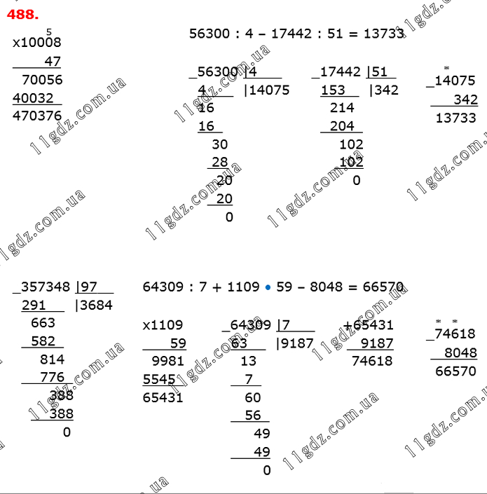 56300 : 4 – 17442 : 51 = 13733 64309 : 7 + 1109 • 59 – 8048 = 66570