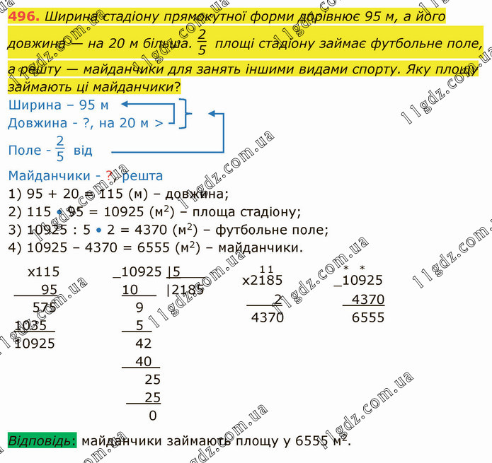 Ширина стадіону прямокутної форми дорівнює 95 м, а його довжина — на 20 м більша. 2/5 площі стадіону займає футбольне поле, а решту — майданчики для занять іншими видами спорту. Яку площу займають ці майданчики? Ширина – 95 м Довжина - ?, на 20 м > Поле - 2/5 від Майданчики - ?, решта 1) 95 + 20 = 115 (м) – довжина; 2) 115 • 95 = 10925 (м2) – площа стадіону; 3) 10925 : 5 • 2 = 4370 (м2) – футбольне поле; 4) 10925 – 4370 = 6555 (м2) – майданчики.