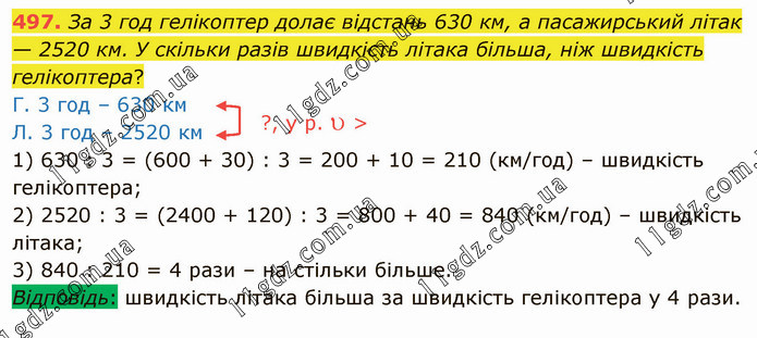 За 3 год гелікоптер долає відстань 630 км, а пасажирський літак — 2520 км. У скільки разів швидкість літака більша, ніж швидкість гелікоптера? Г. 3 год – 630 км Л. 3 год – 2520 км 1) 630 : 3 = (600 + 30) : 3 = 200 + 10 = 210 (км/год) – швидкість гелікоптера; 2) 2520 : 3 = (2400 + 120) : 3 = 800 + 40 = 840 (км/год) – швидкість літака; 3) 840 : 210 = 4 рази – на стільки більше. Відповідь: швидкість літака більша за швидкість гелікоптера у 4 рази.