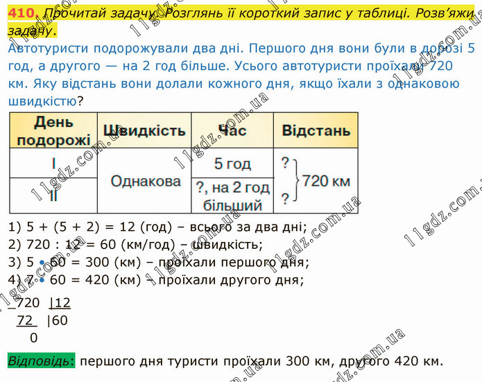 Прочитай задачу. Розглянь її короткий запис у таблиці. Розв’яжи задачу. Автотуристи подорожували два дні. Першого дня вони були в дорозі 5 год, а другого — на 2 год більше. Усього автотуристи проїхали 720 км. Яку відстань вони долали кожного дня, якщо їхали з однаковою швидкістю? 1) 5 + (5 + 2) = 12 (год) – всього за два дні; 2) 720 : 12 = 60 (км/год) – швидкість; 3) 5 • 60 = 300 (км) – проїхали першого дня; 4) 7 • 60 = 420 (км) – проїхали другого дня;