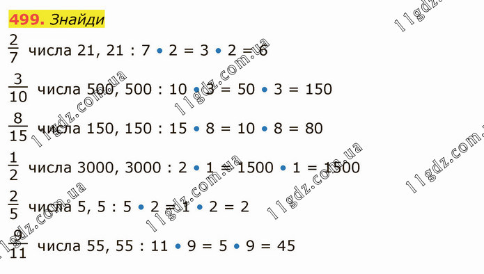 Знайди 2/7 числа 21, 21 : 7 • 2 = 3 • 2 = 6 3/10 числа 500, 500 : 10 • 3 = 50 • 3 = 150 8/15 числа 150, 150 : 15 • 8 = 10 • 8 = 80 1/2 числа 3000, 3000 : 2 • 1 = 1500 • 1 = 1500 2/5 числа 5, 5 : 5 • 2 = 1 • 2 = 2 9/11 числа 55, 55 : 11 • 9 = 5 • 9 = 45