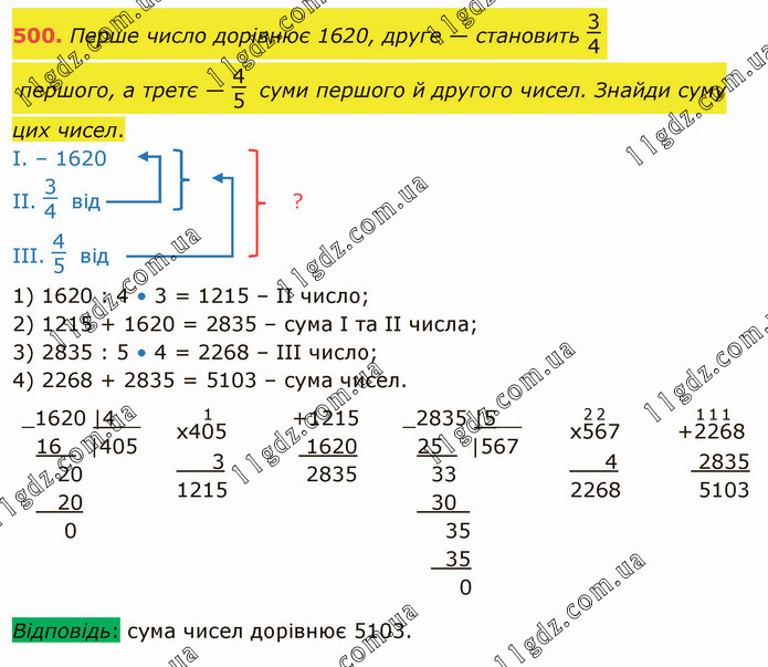 Перше число дорівнює 1620, друге — становить 3/4 першого, а третє — 4/5 суми першого й другого чисел. Знайди суму цих чисел. І. – 1620 ІІ. 3/4 від ? ІІІ. 4/5 від 1) 1620 : 4 • 3 = 1215 – ІІ число; 2) 1215 + 1620 = 2835 – сума І та ІІ числа; 3) 2835 : 5 • 4 = 2268 – ІІІ число; 4) 2268 + 2835 = 5103 – сума чисел.