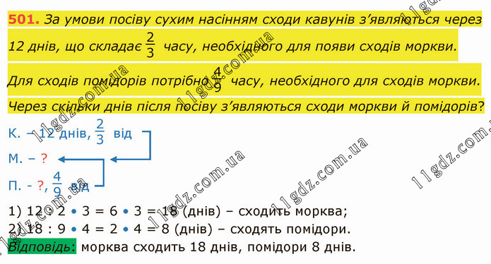 За умови посіву сухим насінням сходи кавунів з’являються через 12 днів, що складає 2/3 часу, необхідного для появи сходів моркви. Для сходів помідорів потрібно 4/9 часу, необхідного для сходів моркви. Через скільки днів після посіву з’являються сходи моркви й помідорів? К. – 12 днів, 2/3 від М. – ? П. - ?, 4/9 від 1) 12 : 2 • 3 = 6 • 3 = 18 (днів) – сходить морква; 2) 18 : 9 • 4 = 2 • 4 = 8 (днів) – сходять помідори. Відповідь: морква сходить 18 днів, помідори 8 днів.