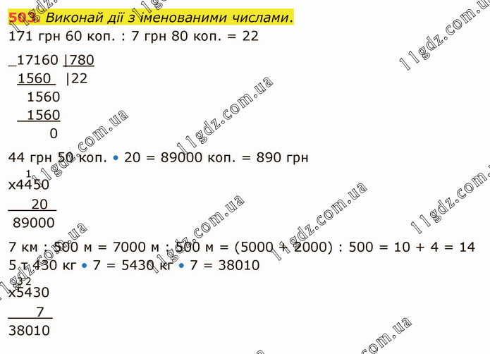 Виконай дії з іменованими числами. 171 грн 60 коп. : 7 грн 80 коп. = 22 44 грн 50 коп. • 20 = 89000 коп. = 890 грн 7 км : 500 м = 7000 м : 500 м = (5000 + 2000) : 500 = 10 + 4 = 14 5 т 430 кг • 7 = 5430 кг • 7 = 38010