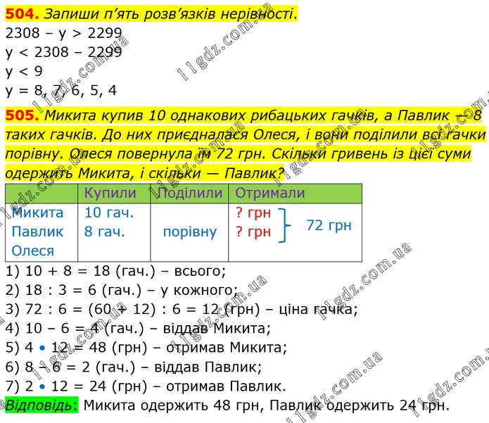 504. Запиши п’ять розв’язків нерівності. 2308 – y > 2299 у < 2308 – 2299 y < 9 y = 8, 7, 6, 5, 4 505. Микита купив 10 однакових рибацьких гачків, а Павлик — 8 таких гачків. До них приєдналася Олеся, і вони поділили всі гачки порівну. Олеся повернула їм 72 грн. Скільки гривень із цієї суми одержить Микита, і скільки — Павлик? 1) 10 + 8 = 18 (гач.) – всього; 2) 18 : 3 = 6 (гач.) – у кожного; 3) 72 : 6 = (60 + 12) : 6 = 12 (грн) – ціна гачка; 4) 10 – 6 = 4 (гач.) – віддав Микита; 5) 4 • 12 = 48 (грн) – отримав Микита; 6) 8 – 6 = 2 (гач.) – віддав Павлик; 7) 2 • 12 = 24 (грн) – отримав Павлик. Відповідь: Микита одержить 48 грн, Павлик одержить 24 грн.