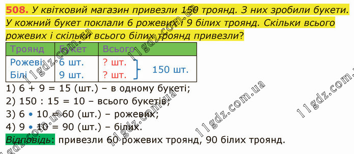 У квітковий магазин привезли 150 троянд. З них зробили букети. У кожний букет поклали 6 рожевих і 9 білих троянд. Скільки всього рожевих і скільки всього білих троянд привезли? Троянд Букет Всього Рожеві Білі 6 шт. 9 шт. ? шт. ? шт. 1) 6 + 9 = 15 (шт.) – в одному букеті; 2) 150 : 15 = 10 – всього букетів; 3) 6 • 10 = 60 (шт.) – рожевих; 4) 9 • 10 = 90 (шт.) – білих. Відповідь: привезли 60 рожевих троянд, 90 білих троянд.