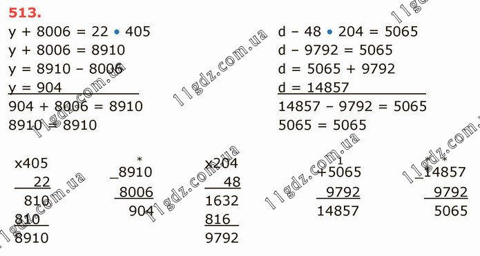 y + 8006 = 22 • 405 у + 8006 = 8910 у = 8910 – 8006 у = 904_________ 904 + 8006 = 8910 8910 = 8910 d – 48 • 204 = 5065 d – 9792 = 5065 d = 5065 + 9792 d = 14857_________ 14857 – 9792 = 5065 5065 = 5065