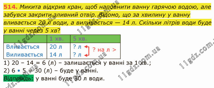 Микита відкрив кран, щоб наповнити ванну гарячою водою, але забувся закрити зливний отвір. Відомо, що за хвилину у ванну вливається 20 л води, а виливається — 14 л. Скільки літрів води буде у ванні через 5 хв? 1 хв. 5 хв. Вливається Виливається 20 л 14 л ? л ? л 1) 20 – 14 = 6 (л) – залишається у ванні за 1 хв.; 2) 6 • 5 = 30 (л) – буде у ванні. Відповідь: у ванні буде 30 л води.