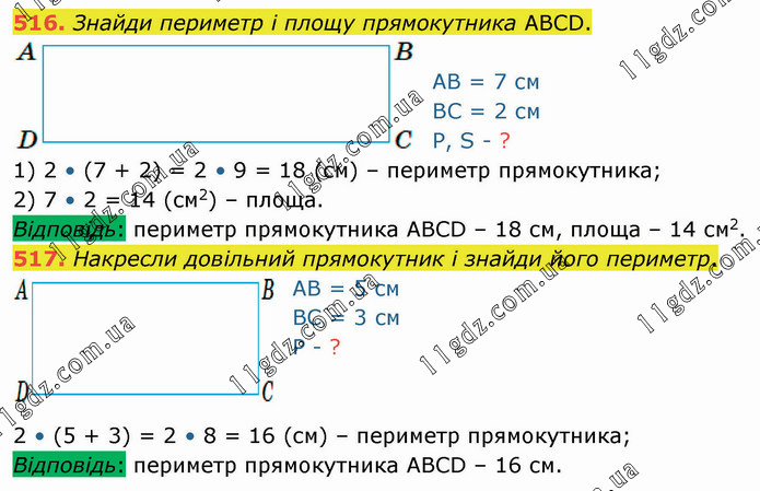 Знайди периметр і площу прямокутника ABCD. АВ = 7 см ВС = 2 см Р, S - ? 1) 2 • (7 + 2) = 2 • 9 = 18 (см) – периметр прямокутника; 2) 7 • 2 = 14 (см2) – площа. Відповідь: периметр прямокутника АВСD – 18 см, площа – 14 см2. 517. Накресли довільний прямокутник і знайди його периметр. АВ = 5 см ВС = 3 см Р - ? 2 • (5 + 3) = 2 • 8 = 16 (см) – периметр прямокутника; Відповідь: периметр прямокутника АВСD – 16 см.