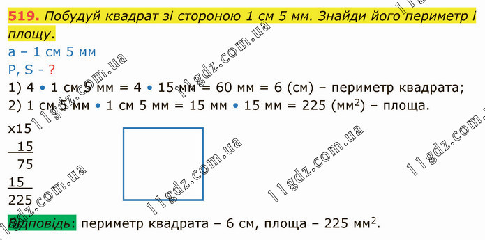 Побудуй квадрат зі стороною 1 см 5 мм. Знайди його периметр і площу. а – 1 см 5 мм Р, S - ? 1) 4 • 1 см 5 мм = 4 • 15 мм = 60 мм = 6 (см) – периметр квадрата; 2) 1 см 5 мм • 1 см 5 мм = 15 мм • 15 мм = 225 (мм2) – площа.