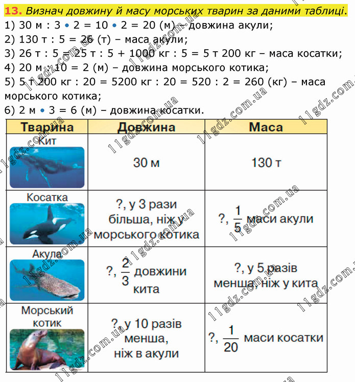 Визнач довжину й масу морських тварин за даними таблиці. 1) 30 м : 3 • 2 = 10 • 2 = 20 (м) – довжина акули; 2) 130 т : 5 = 26 (т) – маса акули; 3) 26 т : 5 = 25 т : 5 + 1000 кг : 5 = 5 т 200 кг – маса косатки; 4) 20 м : 10 = 2 (м) – довжина морського котика; 5) 5 т 200 кг : 20 = 5200 кг : 20 = 520 : 2 = 260 (кг) – маса морського котика; 6) 2 м • 3 = 6 (м) – довжина косатки.