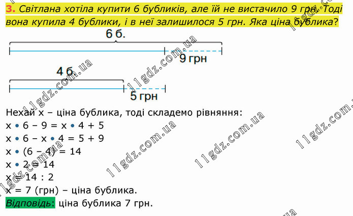 Світлана хотіла купити 6 бубликів, але їй не вистачило 9 грн. Тоді вона купила 4 бублики, і в неї залишилося 5 грн. Яка ціна бублика? Нехай х – ціна бублика, тоді складемо рівняння: х • 6 – 9 = х • 4 + 5 х • 6 – х • 4 = 5 + 9 х • (6 – 4) = 14 х • 2 = 14 х = 14 : 2 х = 7 (грн) – ціна бублика. Відповідь: ціна бублика 7 грн.